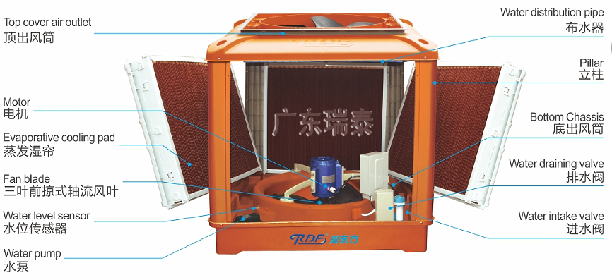 水冷空調的結構包括:濕簾、風葉、電機、水泵、水位傳感器、排水閥、進水閥等組件組成